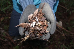「菌ちゃん農法とは、落ち葉や草など自然の物を土へすき込み、土の中の微生物の力を生かして、野菜を元気に育てる農法。土の中の糸状菌が欠かせない」と佐藤さん。約50センチの高さの畝を作り、マルチをかぶせる。土中の糸状菌がすき込んだ葉を餌として繁殖して、2、3カ月かけて一つの畝ができる。「一度畝を作ると菌が年々繁殖して、昨年よりも良い野菜が育つ。2、3年は葉を新しくすき込まなくても同じ畝で栽培ができる」と佐藤さん。準備するものはマルチだけで、農薬や肥料も使用しない。費用を抑えて農業を始めたい人にはぴったりだという。