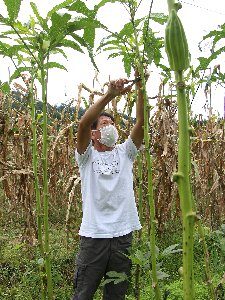 畑の草はすべて刈り取らず、一定の高さで残す。野菜を食害するテントウムシダマシなどが食べる葉を残すことで、被害の減少につながるという。