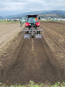 今回はトレンチャーでナガイモの植え溝を掘る作業を実演した。土を深く真っすぐ掘ることがナガイモ栽培には必要だが、負荷をかけないためにもトラクターを低速で走らせなければならない。