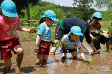 この日初めて田植えをする園児が大半で、真っすぐに植えるための「田植えじょうぎ」を使うなど、昔ながらの田植えを体験した。参加した園児からは「機械で植えているのは見たことがある。はだしは初めてで、泥が冷たかった」と歓声を上げた。