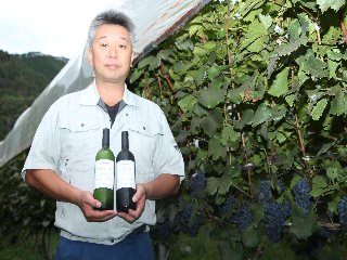 収穫間近のブドウを手に「ようやく自分の畑のブドウを自分の醸造所で仕込み、完全なオリジナルワインを造ることができる。出来上がりが楽しみ」と約8千本のワインを仕込む予定だ。(上川)
